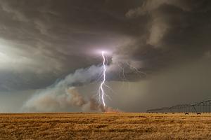 A tall lightning bolt strikes inside a wheat field fire started by an earlier bolt.